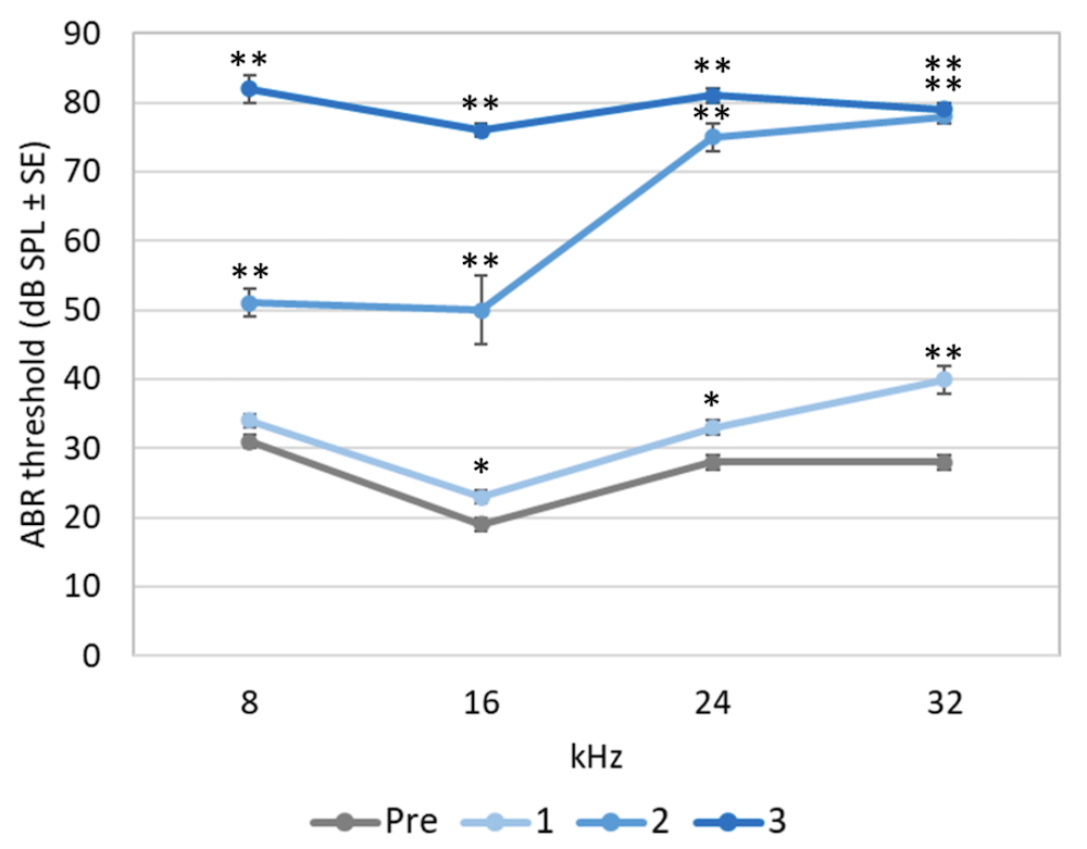 シスプラチンの投与により、ABR音圧閾値の上昇が認められた。